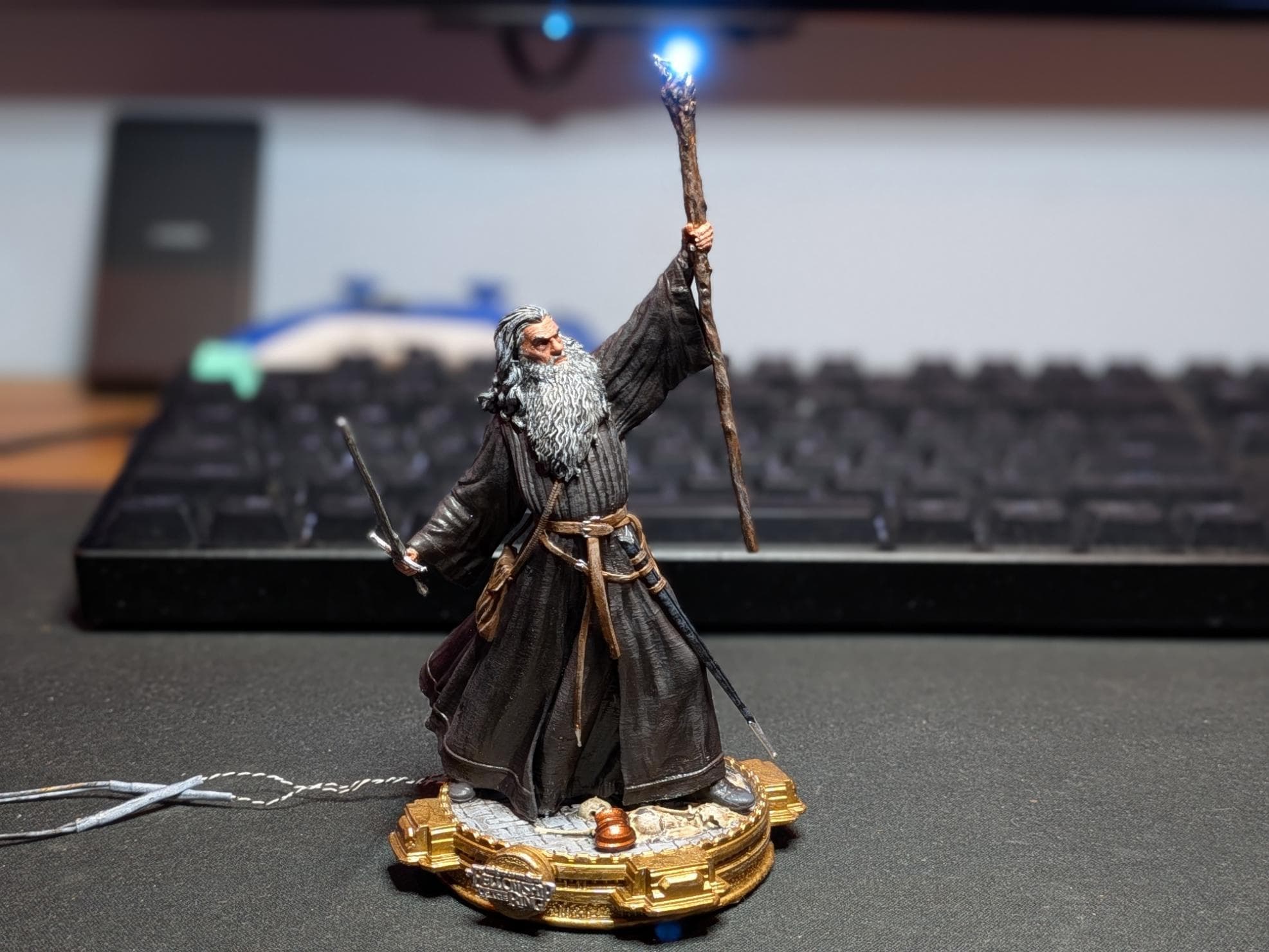 Gandalf - The staff does not glow unless you make it that way. This print will be measured from the top of his hat/head to his feet, the base will not be a part of the measurement, nor will the staff (but yes the base and staff are included).