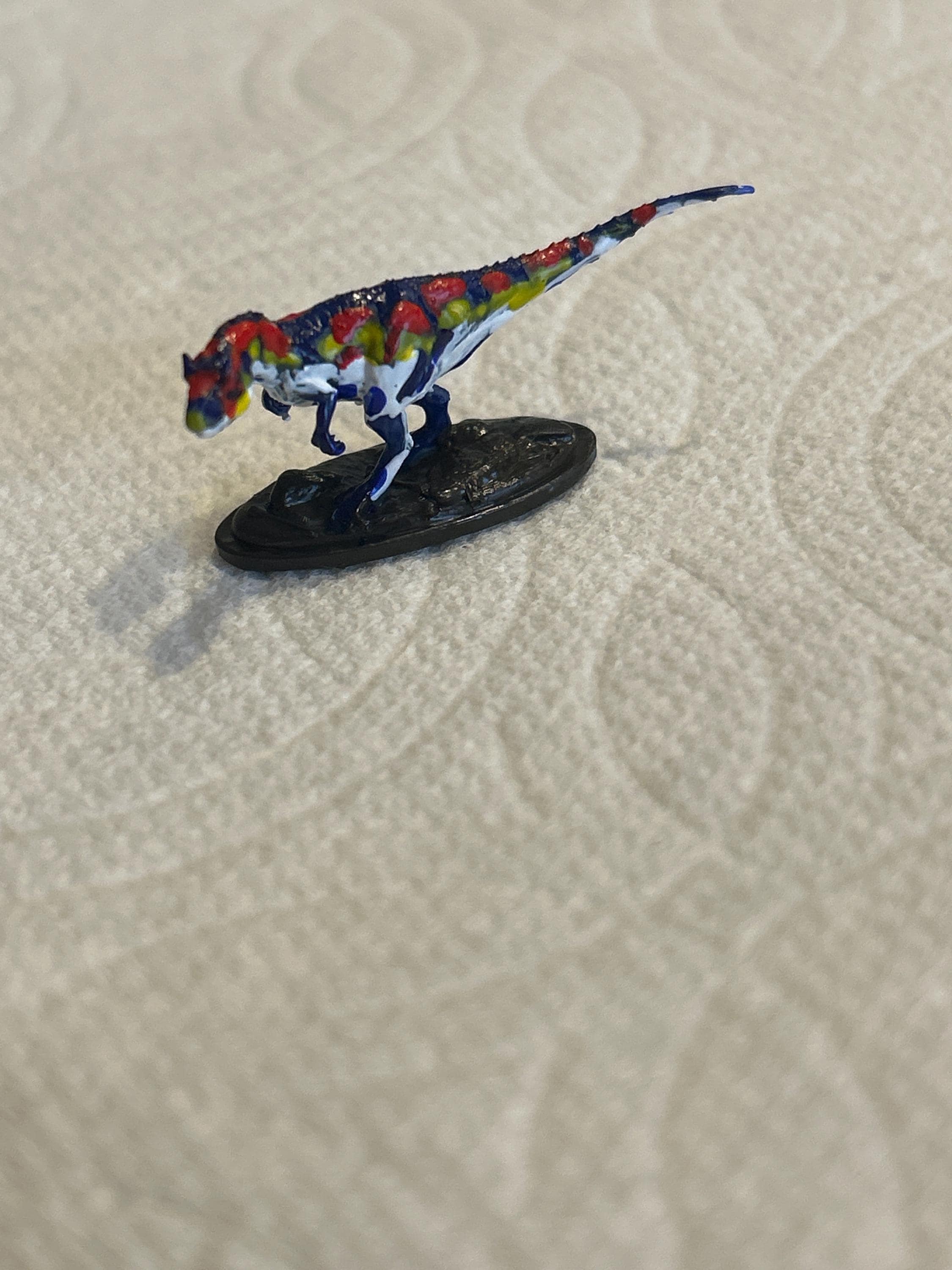 Allosaurus - This print will be measured by the base, so if you order 40mm the base will measure about 1.5 inches in length and the print scaled to match. It will be longer than the base, due to the tail.